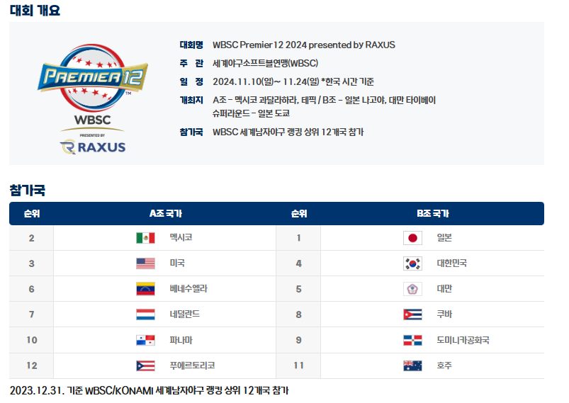 프리미어12는 세계야구소프트볼연맹(WBSC) 주관으로 열리는 대회로, 2024년에는 멕시코에서 개최됩니다. 이 대회는 세계 12개 국가가 참가하여 최고의 자리를 놓고 경쟁하게 됩니다. 이번 대회는 2024년 11월 10일부터 24일까지 진행될 예정입니다.